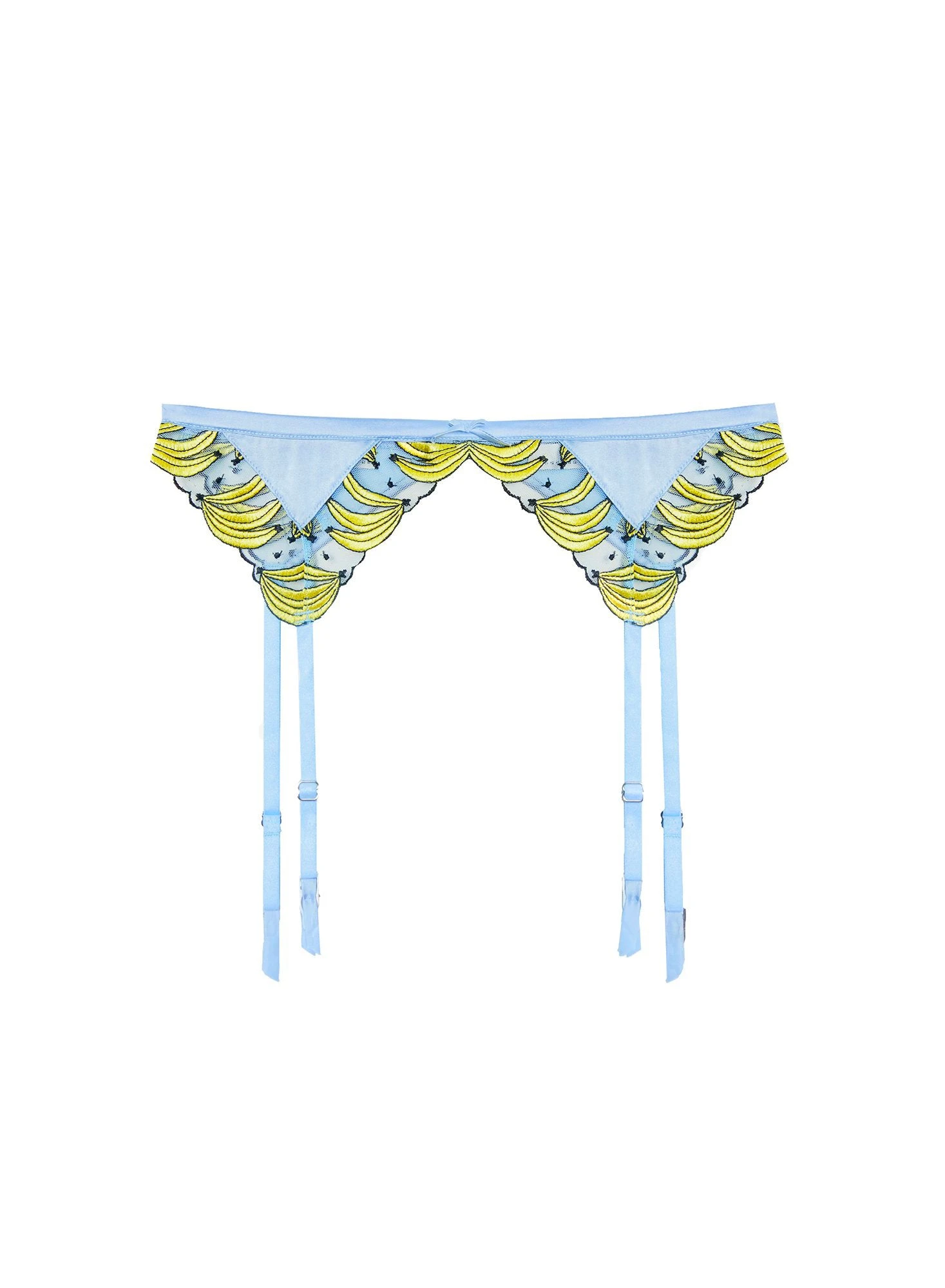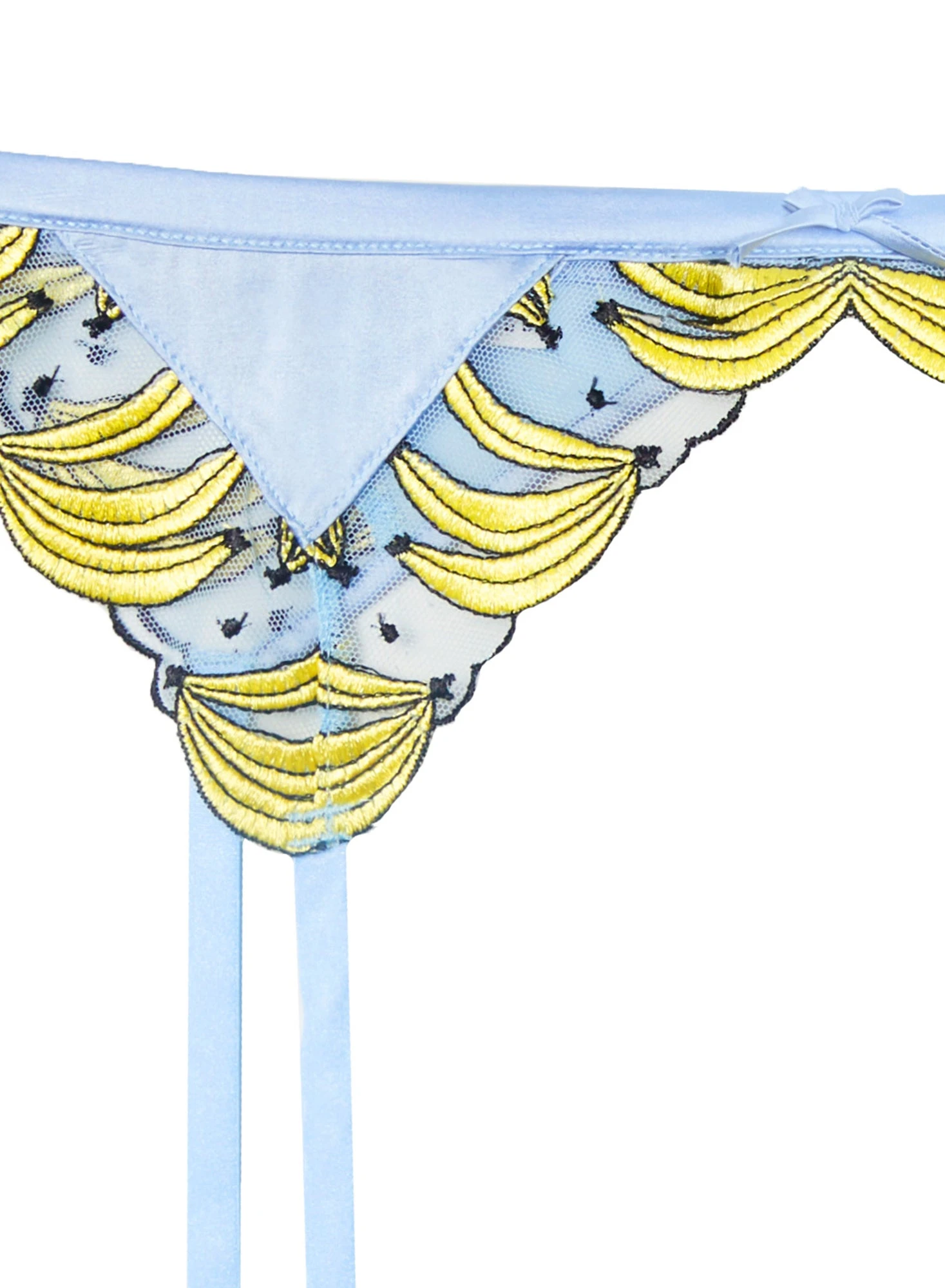 Take a bite, baby. Our Banana Embroidery Garter Belt is the perfect addition to amp up your lingerie set. Features luxe silk charmeuse paneling with custom banana embroidery trim. Center back closure sits at waist. Pair with the matching Banana Embroidery Balconette Bra and Tanga for an immaculate set.