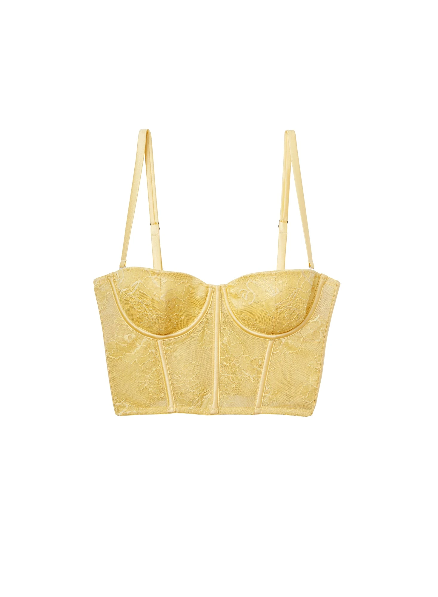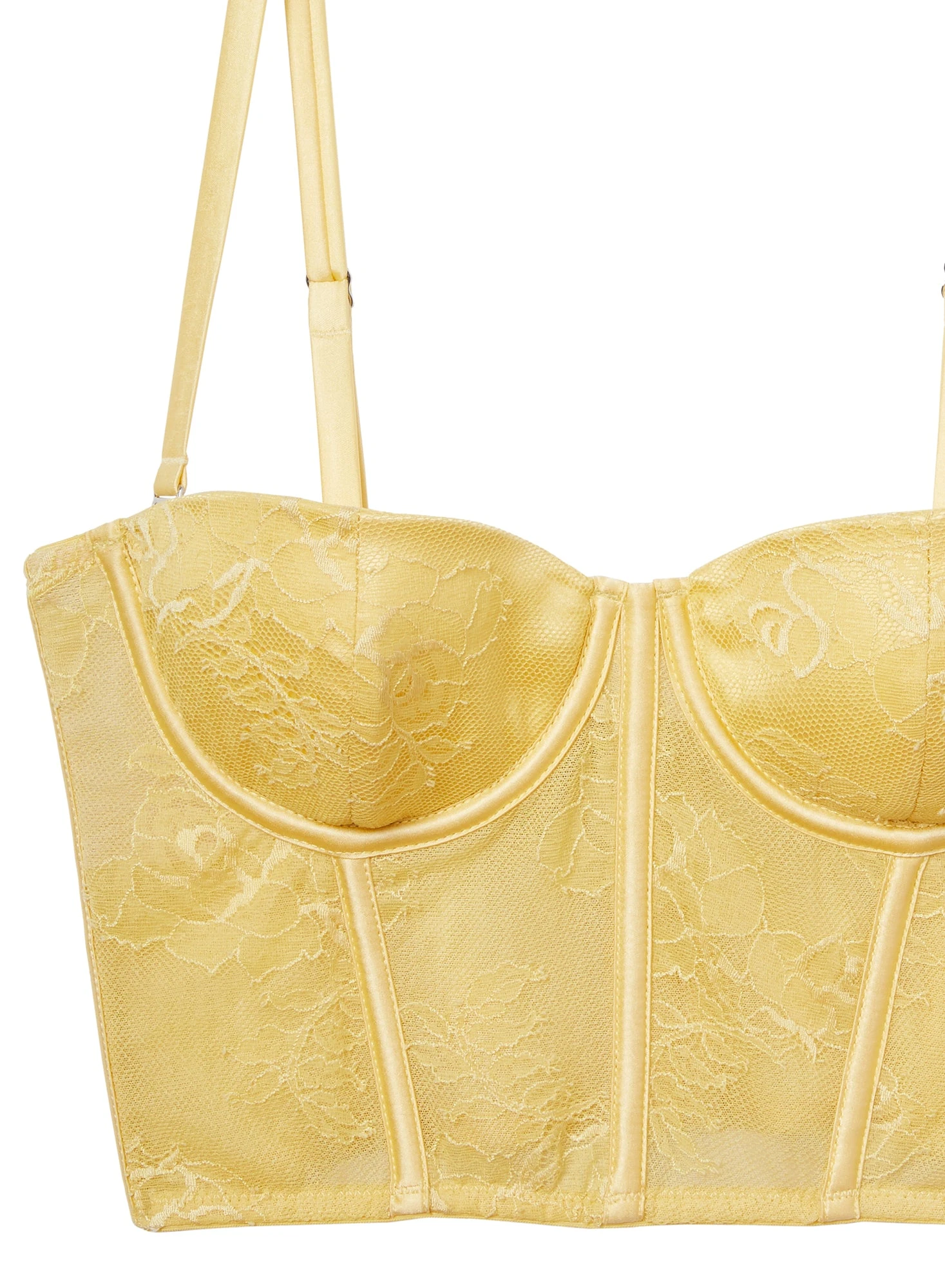 Bare it all. Our Bouquet Lace Bustier top in daffodil. Made with super soft stretch lace. Soft boning with structured cups gives you natural shape and lift. Zipper closure and subtle, stretch ribbing in back. Removable straps. Complete the look with the matching Bouquet Lace Cheeky, or take it out with the High Slit Skirt.