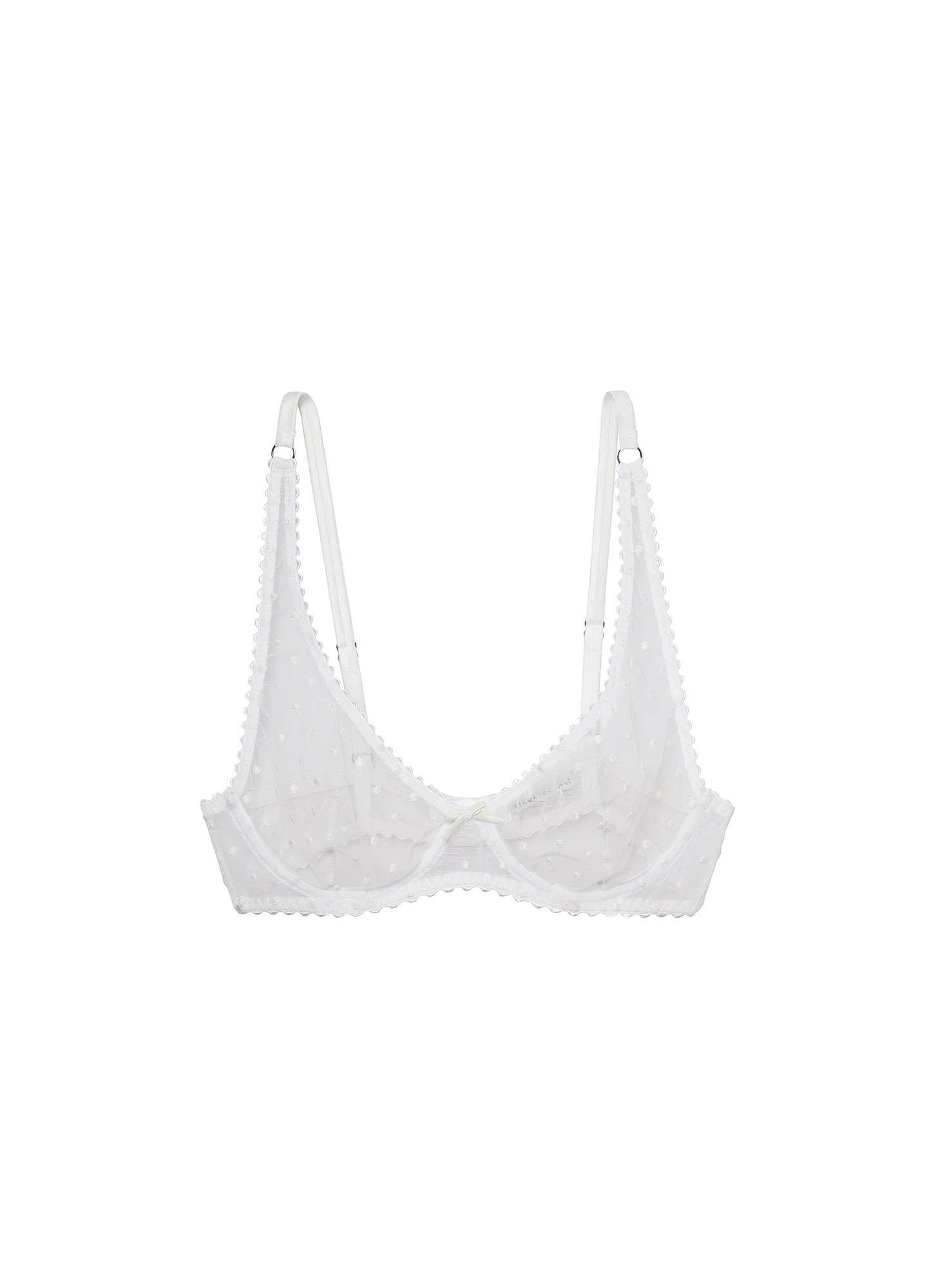 Girls on film. Our ultra flirty Dotty Tulle Bra cut from sheer tulle with beautiful embroidered dot detailing. Scalloped underwire cups offer great support and shape. Features front bow and silk covered adjustable straps with o-ring detail. Center back closure. Complete the set with the matching Dotty Tulle Heart Shaped Cheeky, or take it out with the Knit Shrug.