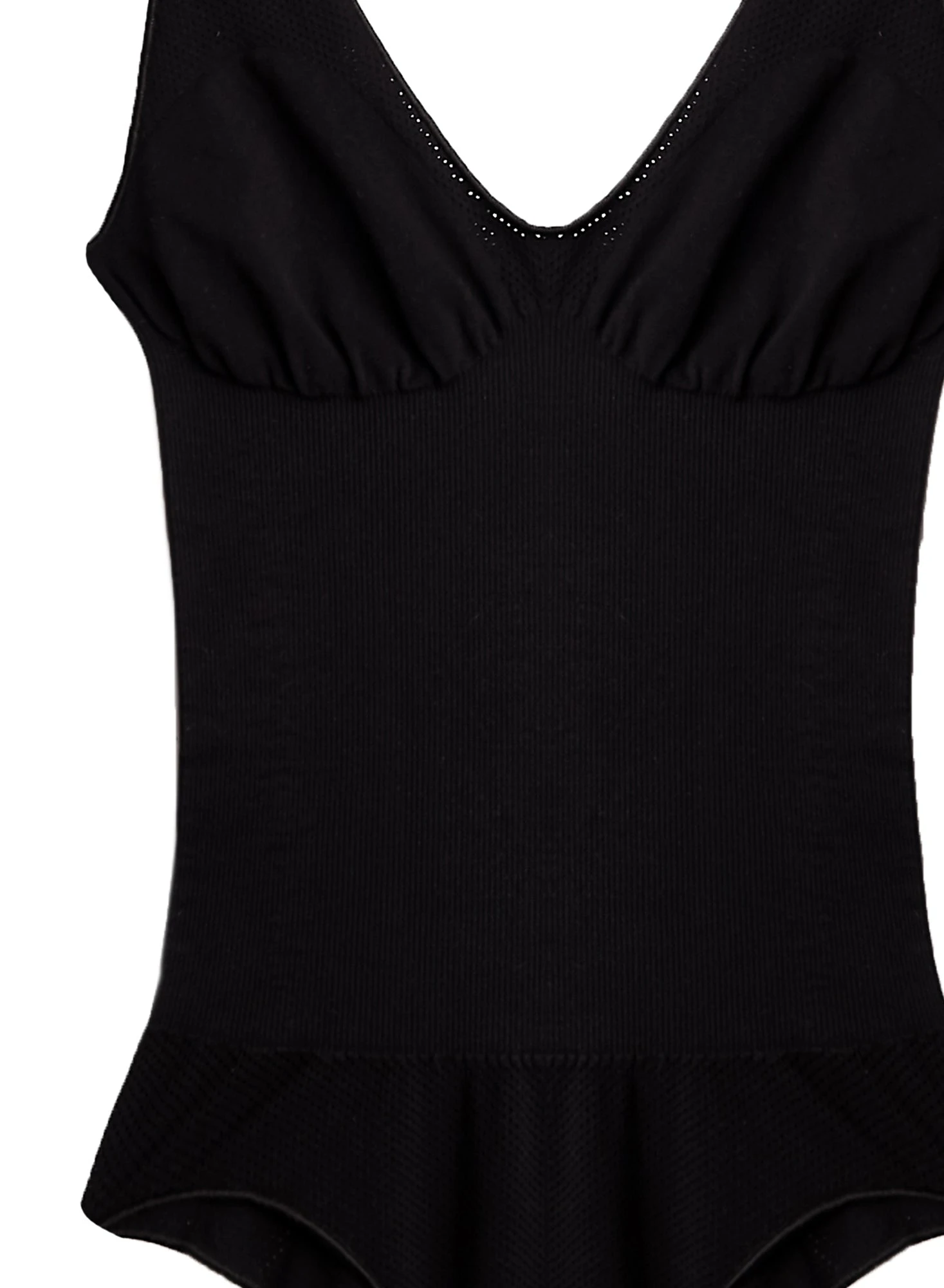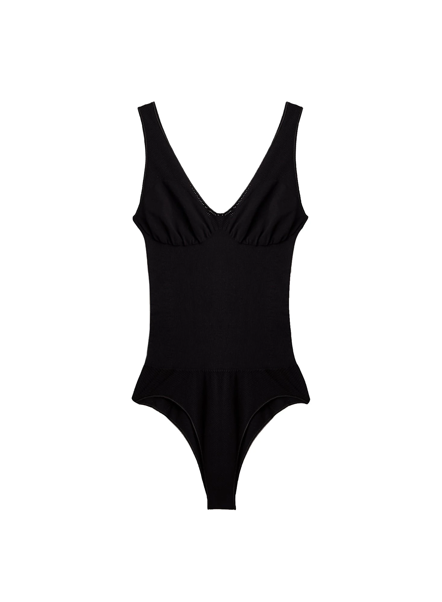 Le Body by Fleur du Mal. The Control Bodysuit, cut from our new super soft, zero waste knit material. Features ribbed detail along torso for waist cinching compression, while ruched underwire-free cups provide weightless support. Seamless comfort with thong cut back. Works flawlessly as a base layer, or flaunted all on its own.