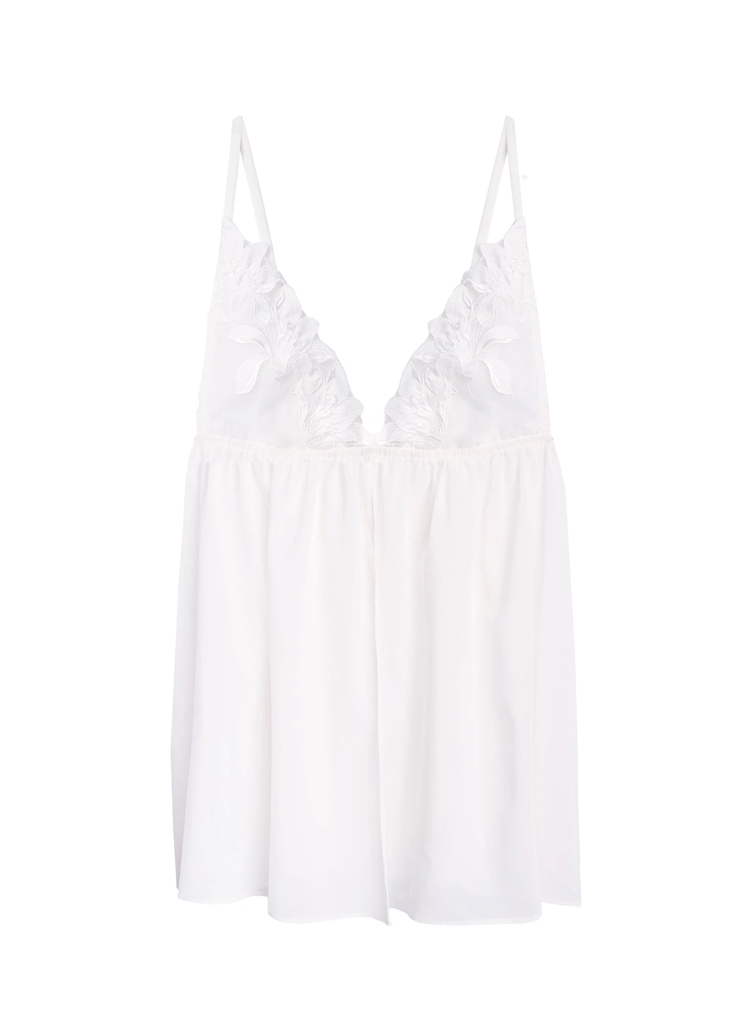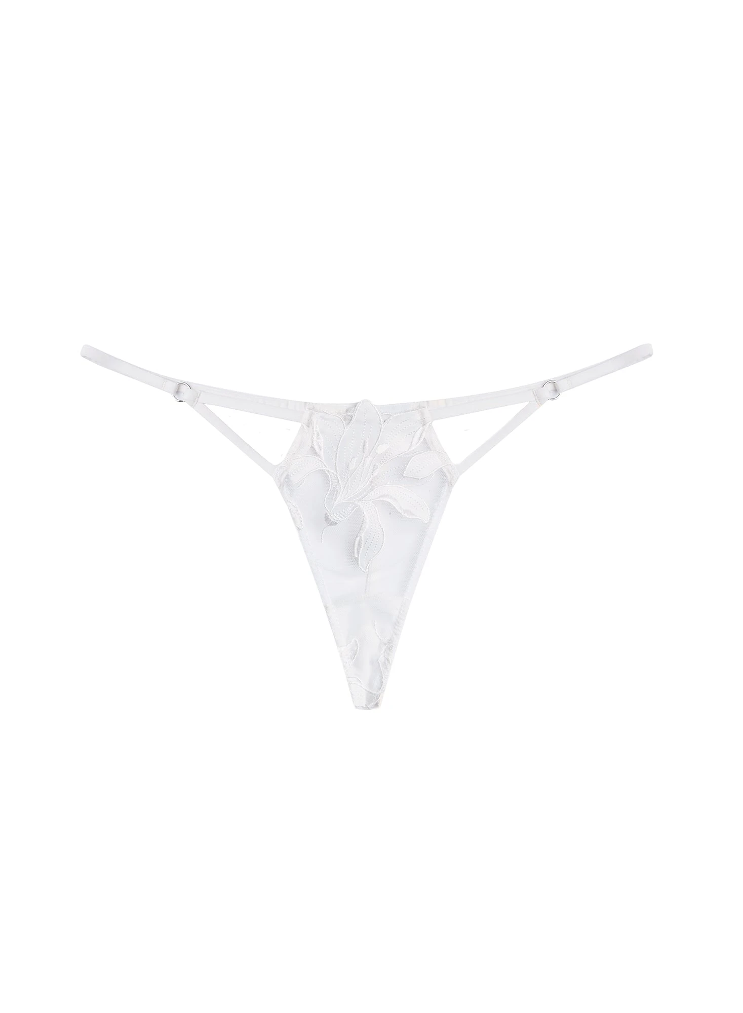 Our Lily Embroidery Babydoll & V String Set is an unforgettable after dark set. Lily Embroidery Babydoll features triangle cups accented with our classic lily embroidery and flirty front slit. Matching Lily Embroidery V String goes perfectly underneath. Adjustable shoulder and side straps on babydoll and panty for a perfectly customizable fit.Â