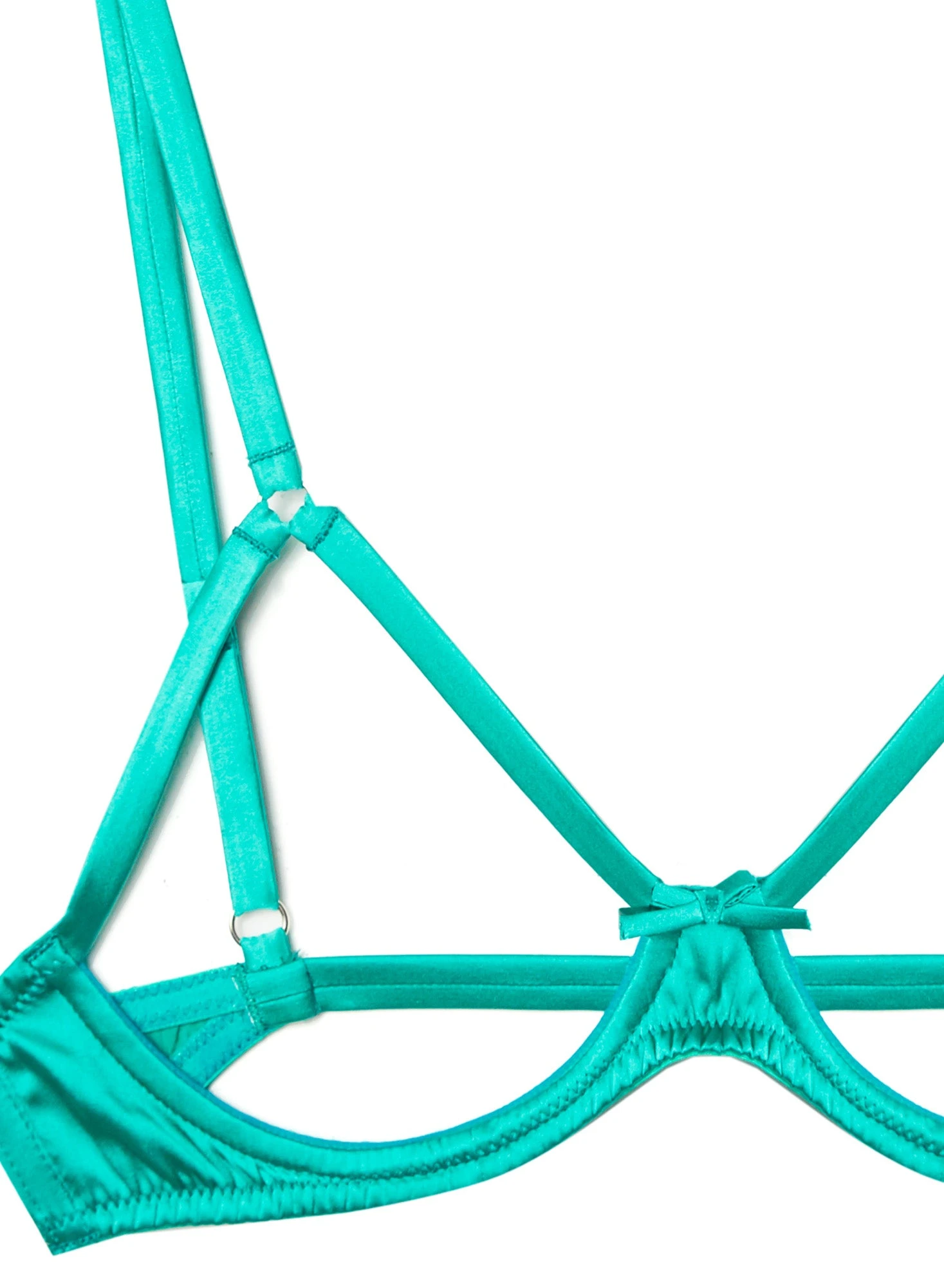 Bound to please. This sexy bondage bra features open, exposed cups and o-ring strap detail. Bow at center front and stretch band with hook closure. Underwire and adjustable straps provide subtle shaping and lift. Pair with matching Luxe Crotchless Thong.