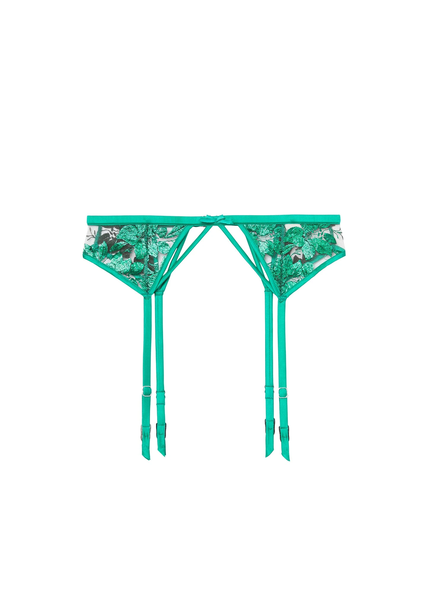 Green with envy. Our Pressed Floral Embroidery Garter is the perfect addition to amp up your lingerie set. Features stunning soft, iridescent pressed flower embroidery on sheer stretch tulle. Silk covered adjustable straps and elastic waistband. Center back closure sits at waist. Complete the set with the matching Pressed Floral Embroidery Bra and Panty.