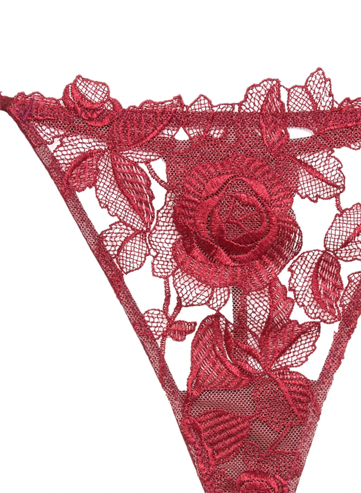 Coming up roses. Our Rose Embroidery V String features custom Swiss rose embroidery with flirty scalloped front. Ultra sexy v-string back with rose appliqué detail. Complete this stunning set with the matching Rose Embroidery Demi Bra and Garter.