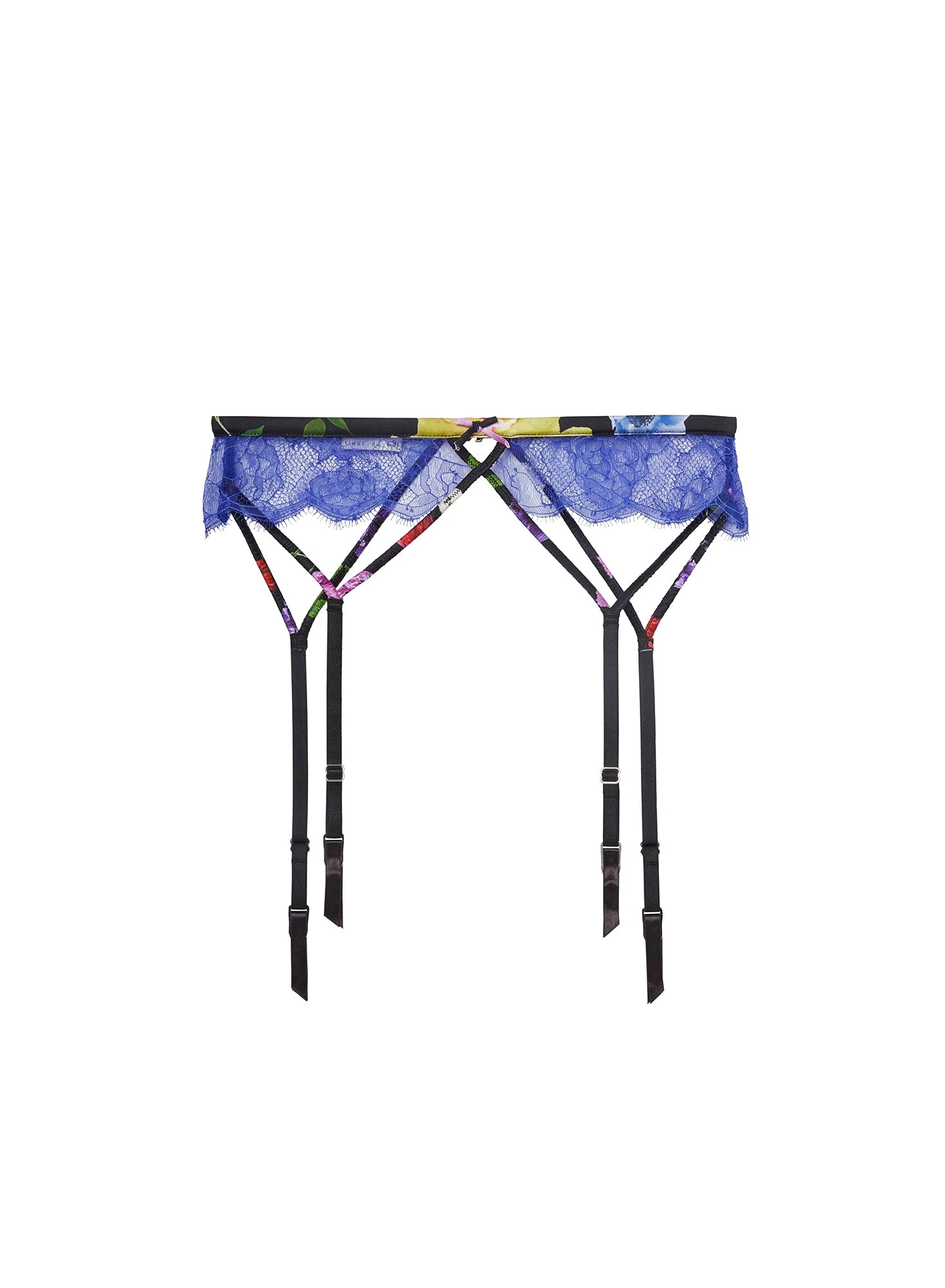 Our Rose Lace Garter is the perfect addition to amp up your lingerie set. Features delicate electric blue French lace paneling, with custom floral printed silk covered adjustable garter straps and elastic waistband. Center back closure sits at waist. Complete this stunning set with the matching Rose Lace Balconette and Thong.