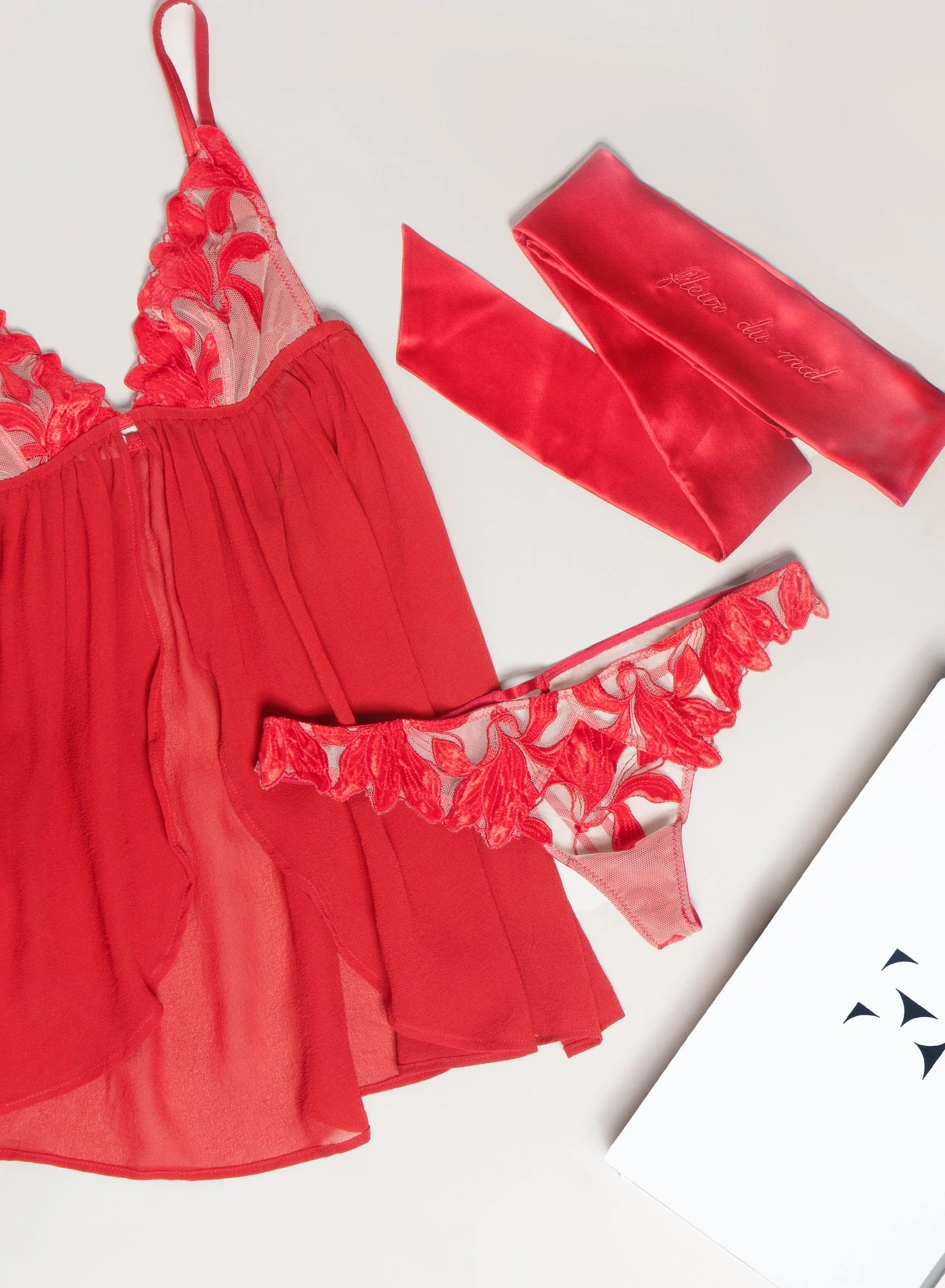 Oh, baby. Created with Dr. Emily Morse, our exclusive Sex with Emily Bundle features our red hot Velvet Lily Embroidery Babydoll with matching Velvet Lily Embroidery Hipster Thong, plus best selling embroidered Fleur du Mal Silk Blindfold. Put the bundle to work with collectible bondage how-to card written by Dr. Emily and Fleur founder Jennifer Zuccarini. Beautifully gift wrapped in Fleur logo box.