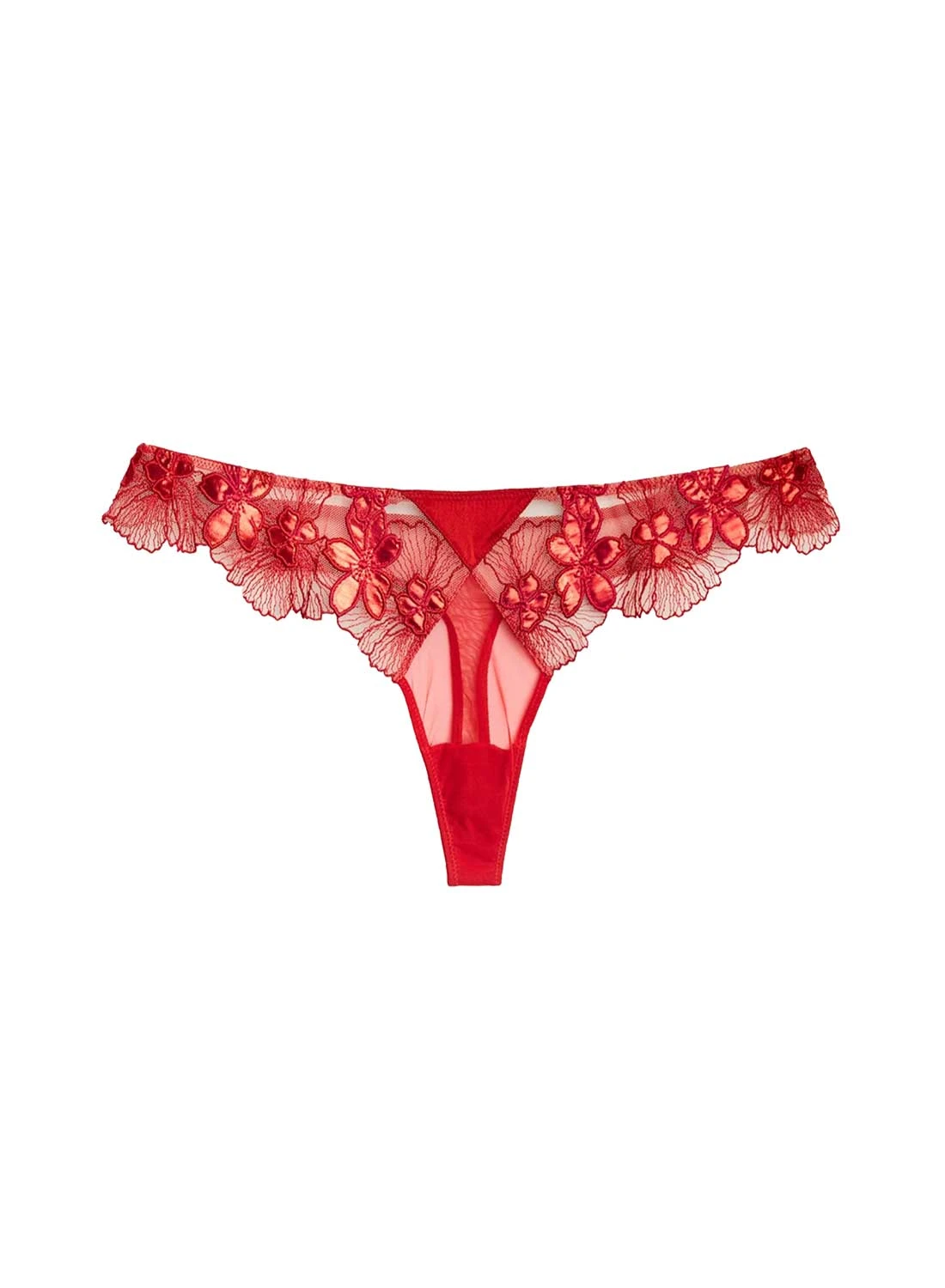 Ultra violet. This delicate Violet Thong features textured metallic violet embroidery accented with scalloped edges. Stretch sheer tulle paneling with thong cut back. Pair with the Violet Balconette Bra and Garter for an immaculate set.Â